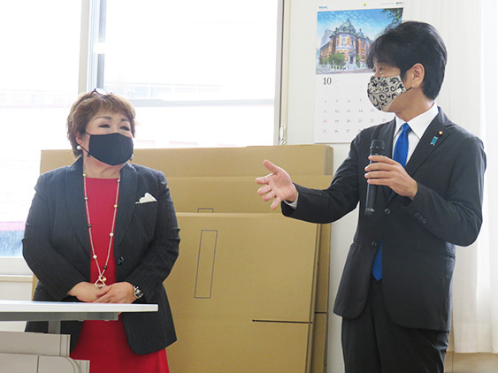 10月23日、元法務副大臣/衆議院議員の義家弘介議員、神奈川県議会の山口美津夫議員がご来社されました。お二方にはダブルレイヤードマスク(ジャガード)をご着用いただき、義家弘介議員から全スタッフに向けて以下の内容のお話を頂戴しました。 「今後もマスクが必須で、たくさんの種類の中からマスクを選んでいく時代の中、デパートにもマスクコーナーがあり、デザインで選ぶ方も増えてきました。アトリエヨシノのマスクは肌に張り付かず、スポー...